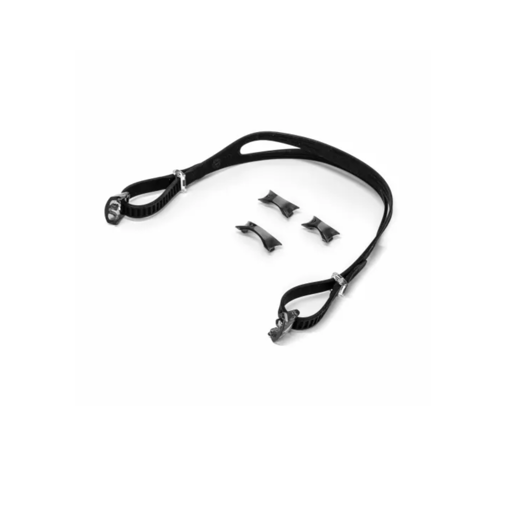 Besteht aus einem schwarzen Kopfband mit zwei schwarz-grauen Schnallen, drei rauchgrauen Nasenstegen und einem Kunststoffetui mit Reißverschluss.