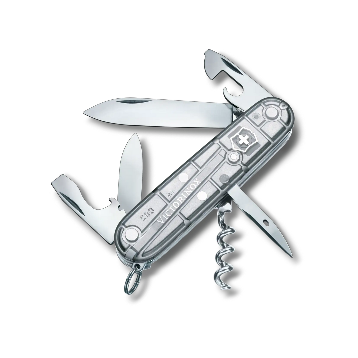 Klinge, gross / Klinge, klein / Korkenzieher / Stech-Bohr-Nähahle / Ring / Pinzette / Zahnstocher / Dosenöffner / Kapselheber / Schraubendreher 6 mm / Schraubendreher 3 mm / Drahtabisolierer